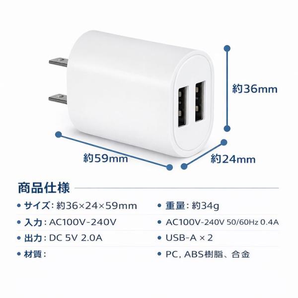 2口 USBアダプタ スマホ 充電器 ACアダプタ コンセント 5V 2.4A 12W チャージャー アンドロイド アイフォン タイプC PSE 急速充電