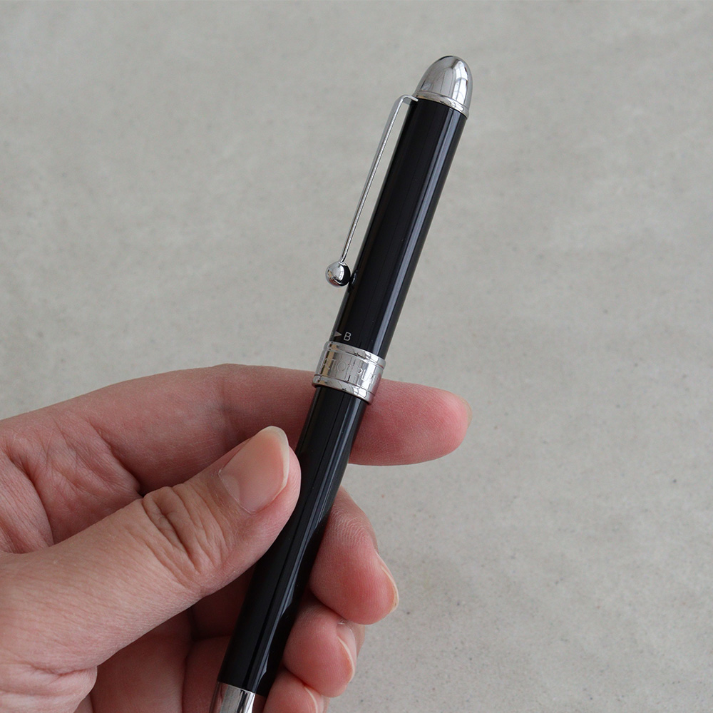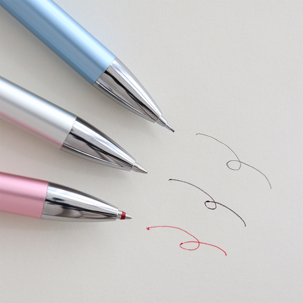 商品について|シャープペンシル:0.5mm消しゴム付き/ボールペン(黒・赤):0.7mm、長さ約142.5mm、重さ約21.2g、最大胴軸径約11.9mmφ(クリップを除く)