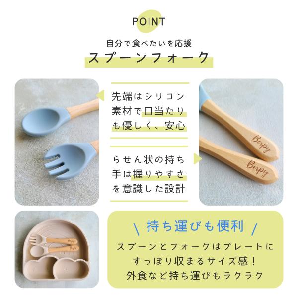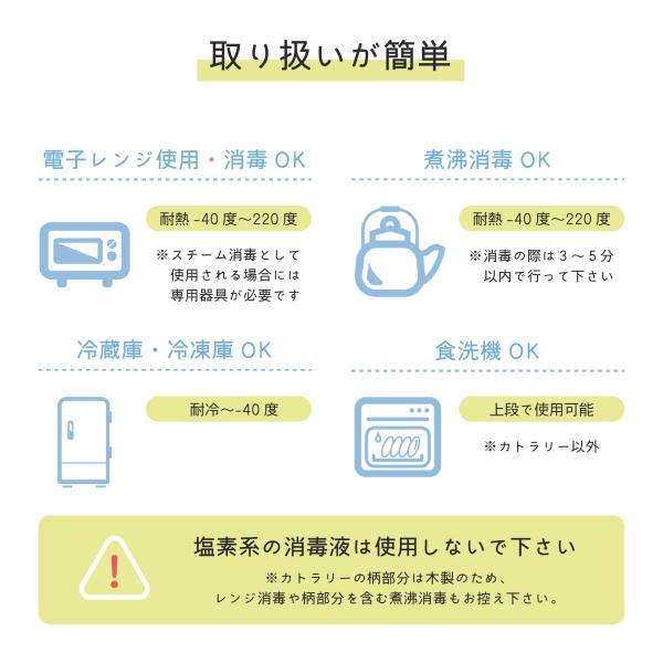 ※シリコンスプーン・フォークは持ち手に木材を使用しているため、食器洗い乾燥機・電子レンジの使用はお控えください※