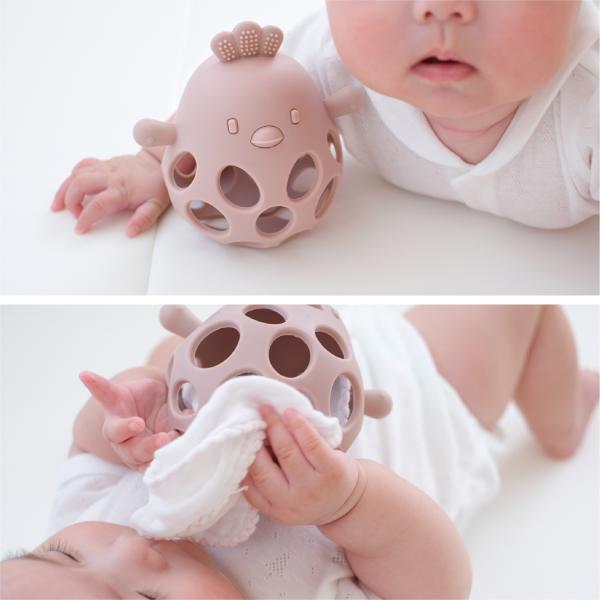 ・ 【チキンボール】 これらを組み合わせ、可愛いデザインと赤ちゃんのためを思って設計されたチキンボール。ストラップと併用すれば、常に遊べるお気に入りのおもちゃに。
