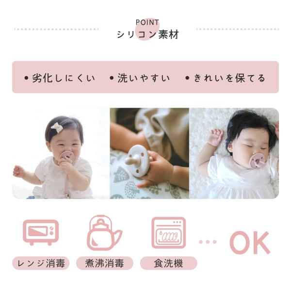 簡単なお手入れ:水洗い、煮沸、電子レンジ、食洗器。-20℃〜220℃の耐熱性を持ったシリコンおしゃぶりは、一般的に行われる全ての殺菌・消毒方法に対応しています。※塩素系の消毒液は使用しないでください。
