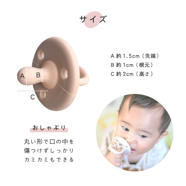 特徴:シンプルな形とやわらかなニュアンスカラーのおしゃれなおしゃぶり。様々なベビーグッズと合わせやすい優しい色合いです。