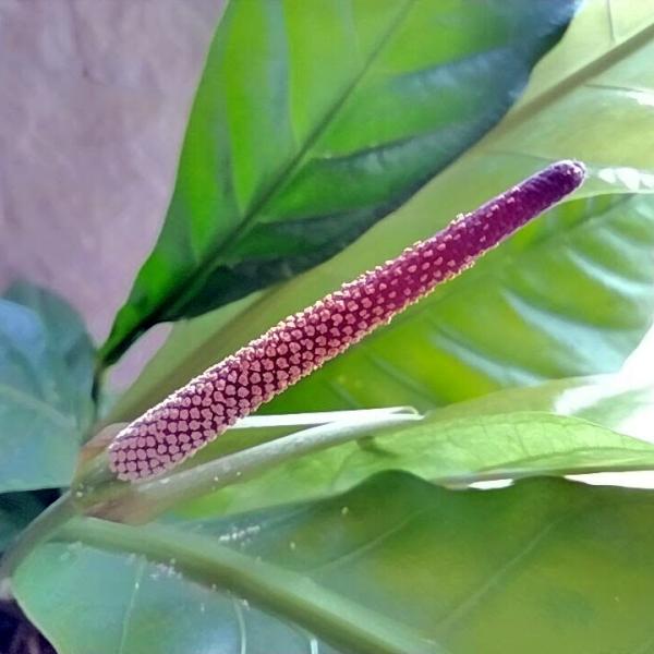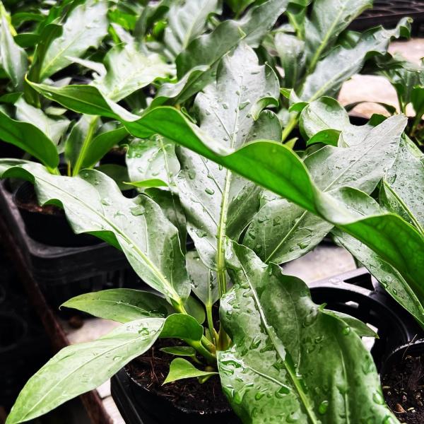 アンスリウムといえば真っ赤な花を咲かせる「アンスリウム アンドレアナム」ですが、こちらは原種系のアンスリウムのため観葉植物っぽさが強い品種です。