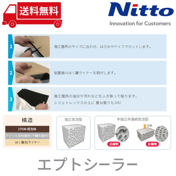 エプトシーラーはあらゆる隙間を埋め、熱と水、音、振動を遮断します。防音・デッドニングにも効果的です。汎用ゴムの中で最も耐久性にすぐれたEPDMゴム発泡体に、粘着技術を組み合わせて開発された高機能シーリング材です。 耐熱性・耐薬品性にもすぐれ、長期にわたって安定した効果を発揮します。また裏面に粘着剤が付いているので、手軽に施工出来ます。