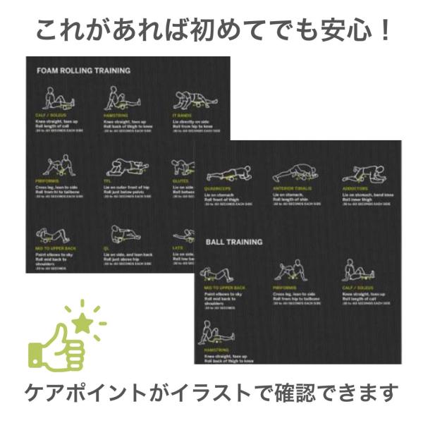 グリッドフォームローラーの使用方法12種類と、マッサージボールの使用方法4種類、合計16種のエクササイズが図解されたピクトグラム付きエクササイズマットです。体のどこを、どのようにローリングすれば良いかがひと目でわかるため、フォームローラーやマッサージボールを使いこなせない初心者でも、正しいセルフケアに取り組みやすい設計。トレーニング前のウォームアップ、運動後のリカバリー、デスクワーク後のリセット、就寝前のストレッチなど、あらゆるシーンで活用できます。マット自体はクッション性があり、床からの冷たさや硬さを軽減。折りたたみ収納もできるため、ジム・自宅・スタジオなど場所を選ばず使えます。フォームローラーとマッサージボールを「正しく」「続けて」使いたい方におすすめの1枚です。