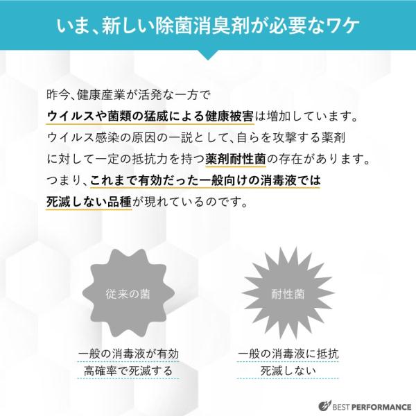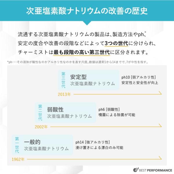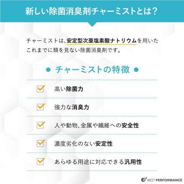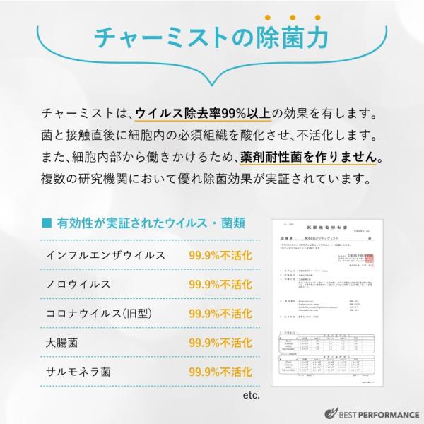 ウイルス除去率は99.9%以上『除菌消臭チャーミスト』の主成分であるW安定型次亜塩素酸ナトリウムが、ウイルスや細菌類へ直接働きかけ、瞬時に99.9%以上不活化、除菌します。除菌効果は第三者機関にて実証済です。※日本食品分析センター調べ