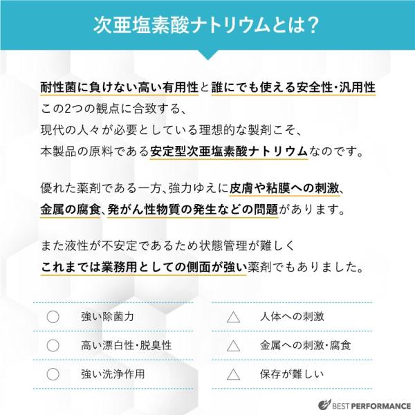 【成 分】次亜塩素酸ナトリウム(有効塩素濃度100ppm)、RO高純水液性:弱アルカリ性