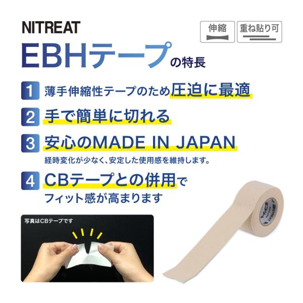 EBHシリーズは、薄手で高い伸縮性を持つテーピングテープです。軽い圧迫を加えるのに適しており、慢性期のケガ対策や関節・筋肉のサポートに幅広くご使用いただけます。