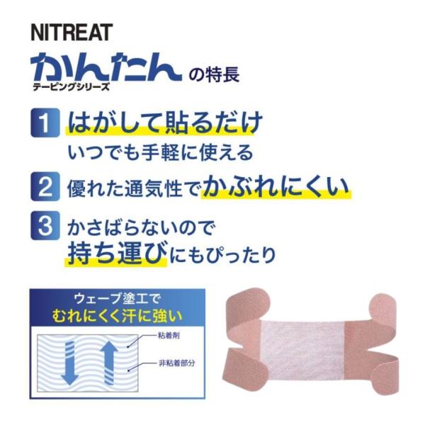 「かんたんテーピング」シリーズは、「テーピングは難しい」という固定観念を打破。初めから貼る部位に合わせてカットされているので、迷わず貼っていただけます。テーピングに初めて挑戦する方でも運動中のトラブルや体の不安を軽減します。「ウェーブ塗工」を採用しているので、接着性を保持しながら、すぐれた通気性を実現します。