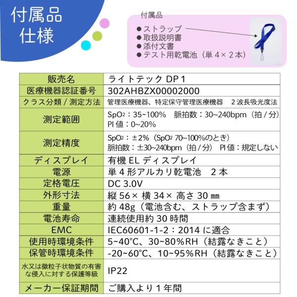 測定精度:SpO2 ±2%、脈拍数 ±2bpmもしくは±2%の大きいほう