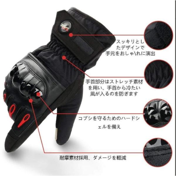 <br>防寒素材、立体成型の作りで握りやすい。甲にはプロテクターを配置、安心安全。<br>もちろんスマホタッチも可能