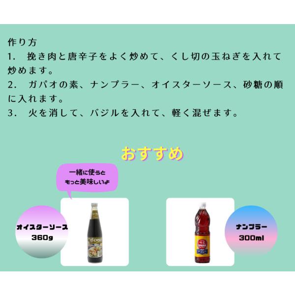 ●原材料:唐辛子、ホーリーバジル、ソイソース(大豆、小麦含む)ニンニク、玉ねぎ、砂糖、大豆油、塩、フィッシュソース(アンチョビ)トウモロコシイースト、でんぷん(タピオカ由来)香料