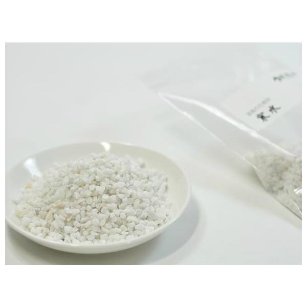 純白に近い真っ白な化粧砂、炭酸カルシウムの結晶のひとつ、白色方解石の一種で、結晶性石灰岩の鉱石・石材名で寒水といいます。和の庭園に雪が積もったような雰囲気にしてくれます。4号鉢一回で約50g使用します。