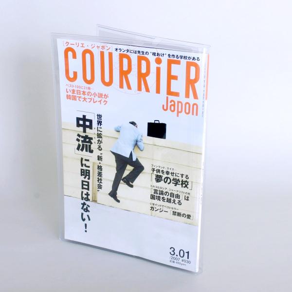 透明のマガジン用カバーです。表紙と背表紙を差し込むだけでスッキリと収まります。