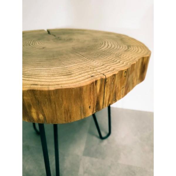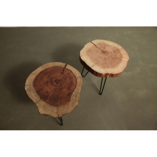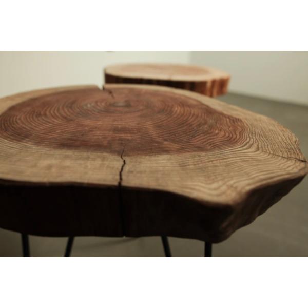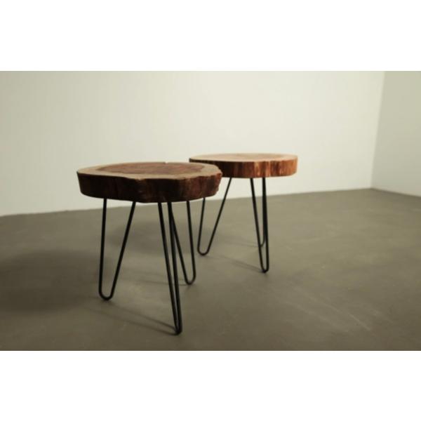 50mmの厚さの切り株の座面で重厚感を出し、丸みを帯びたアイアンで上品さと安定感を持ち、バランスよく構成しました。