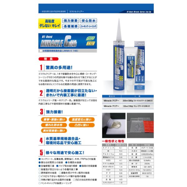 ミラクルクリアーは1本で接着防水を中心に補修・コーキング・シーリングの5つの用途を様々な組み合わせで施工することができる画期的な製品です。