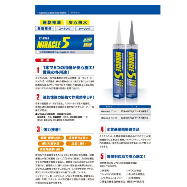 Miracle5 一本で5つ(接着・防水・補修・コーティング・シーリング)の用途が安心施工。驚異の多用途。
