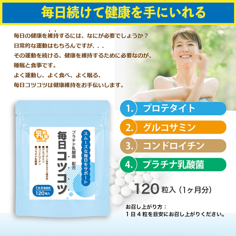 骨 ひざ 膝 関節 サプリ 毎日コツコツ グルコサミン コンドロイチン プロテタイト ビタミンD3 プラチナ乳酸菌 口腔 炎症 ひざ 免疫 腸活 サポート 120粒×1
