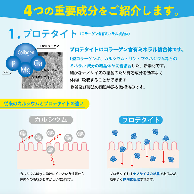 ※プロテタイトとは骨の健康に重要な役割を果たすI型コラーゲンに、カルシウム・リン・マグネシウムなどの