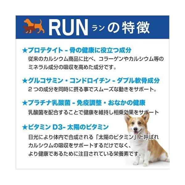 骨、関節をサポートするサプリメントRUN(ラン)は、グルコサミン&コンドロイチンに加えて、プロテタイト(コラーゲン含有ミネラル複合体成分)を配合しました。さらに、乳酸菌で健康を維持し、5つの成分の相乗効果をサポートします。与えやすいチーズ味ですので、おやつ感覚で与えることができます。