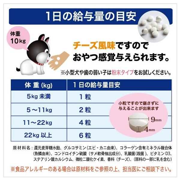 ドロイチン含有)、乳酸菌殺菌粉末(国内製造)/ビタミンD3、ステアリン酸カルシウム、微粒二酸化イ素、香料(チーズ)、「(一部に乳を含む)」