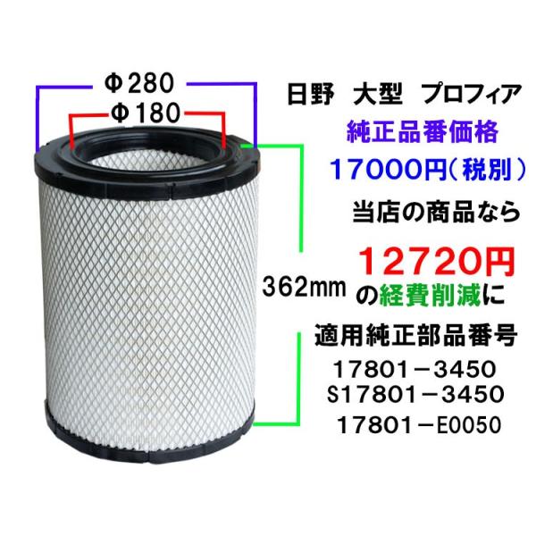 エアフィルター エアエレメント トラック 大型 日野 プロフィア 純正番号17801−3450 エアーフィルター エアーエレメント