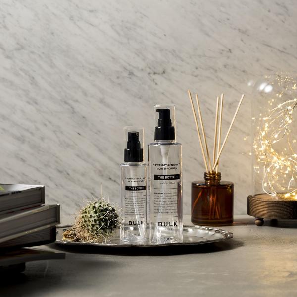 お客様から製品化してほしいというお声を多数いただいたため、デザインと形を一新し、THE BOTTLEとして製品化しました。プッシュ数で使用量が確認できることで、SKIN CAREの効率を上げることはもちろん、毎日使うものなので、ボトルが凹んだりしないようにしっかりした厚みを持たせた素材で、キャップ付きで衛生的に使えるものにしました。化粧水用は200mL、本製品と同サイズでご用意しました。