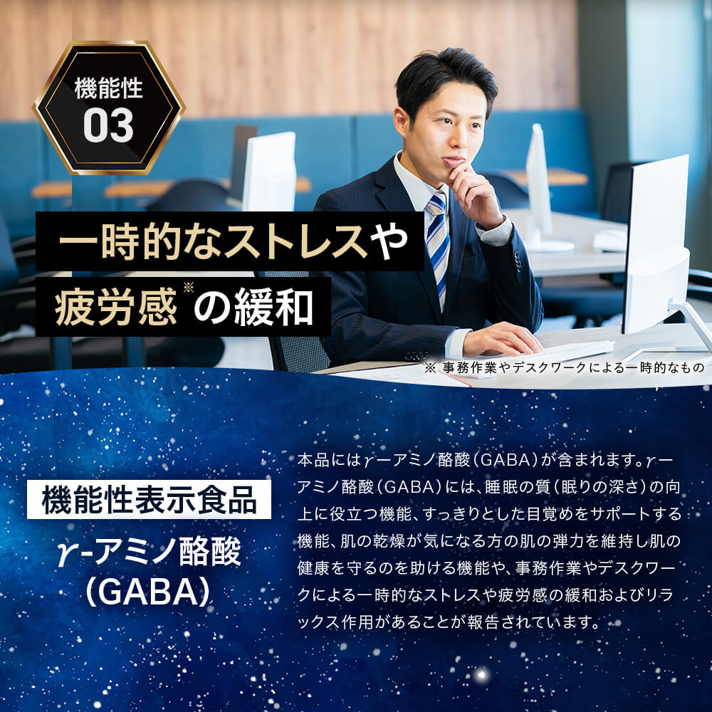 エネルギー:106kcal、たんぱく質:16.8g、脂質:2.4g、炭水化物:4.4g、食塩相当量:0.3g、亜鉛:15mg、マグネシウム:130mg〜205mg、ナイアシン:3.0mg、ビタミンB1:0.54mg、ビタミンB2:0.54mg、ビタミンB6:0.60mg、ビタミンB12:1.3μg、ビタミンC:100mg、ビタミンD:8.5μg〜14.3μg、葉酸:38μg〜81μg、ネムノキ樹皮抽出物:50mg、機能性関与成分:γ-アミノ酪酸(GABA):100mg※ビタミンC、ビタミンD、亜鉛は、厚生労働省「日本人の食事摂取基準(2020年度版)/18〜49歳男性の1日量」に相当。ビタミンB1、ビタミンB2、ビタミンB6、ビタミンB12、マグネシウムは「1/3日量」に相当する量を配合。