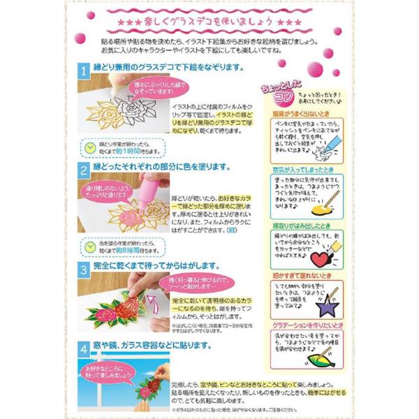 【商品説明】のりと絵の具が合体した、乾くとステンドグラスに似たカラフルで透明感のあるシールになる不思議な絵の具です。窓ガラスや鏡、ガラス容器などに貼ってはがせるので、季節のイベントごとにお部屋や小物を飾りつけたり楽しみ方はいろいろ。【仕様】●セット内容:グラスデコ10.5ml×12カラー、フィルムシート×5枚、作品参考例、下絵イラスト集●カラー内容:縁取り兼用ブラック、縁取り兼用ゴールド、サニーイエロー、オレンジ、ポピーレッド、バイオレット、スカイブルー、コバルトブルー、ロイヤルグリーン、ソフトブラウン、スノーホワイト、スパークルピンク●主成分(グラスデコ):ポリアクリルエマルジョン
