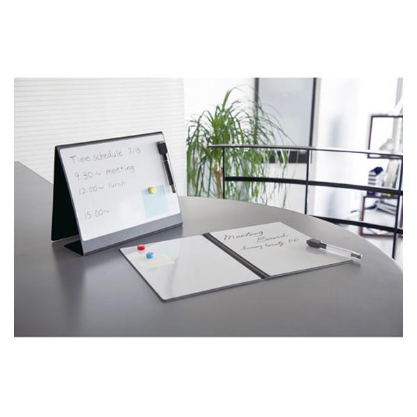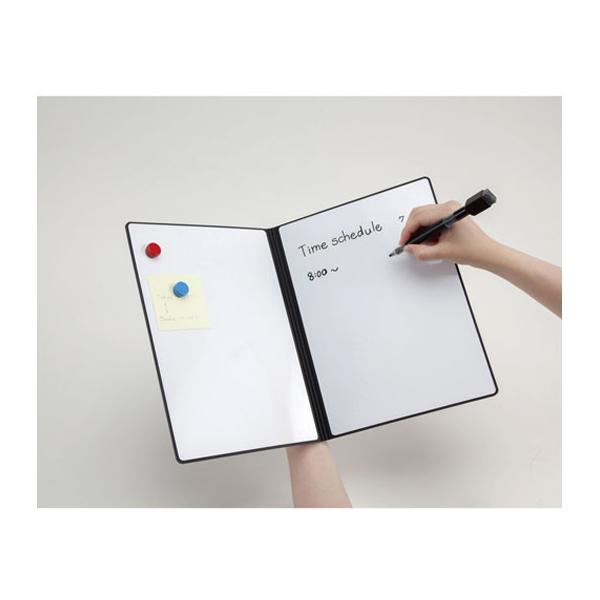 【仕様】持ち運びができるホワイトボードA4サイズだから持ち運びラクラク♪バッグに、本棚に、簡単に収納できます。※シート自体に磁力はありません。 ●サイズ:縦310×横230×幅9mm(折り畳み時) 縦310×横462mm(展開時)●ホワイトボード面一枚あたりのサイズH304×W218mm●仕様:A4/両面●カラー:ブラック●本体材質:再生発泡PP 1.8mm厚●ホワイトボードシート0.5m厚(PVC+鉄粉入シート)