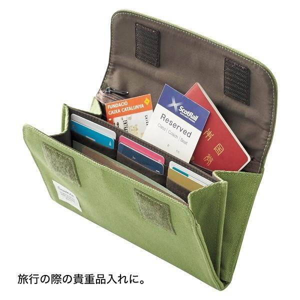 大きく開いて中身が確認しやすいジャバラタイプ。簡単に開閉できて収容量に対応しやすい面ファスナーが付いています。ポーチ中央にはカードが12枚収納できる仕切りポケット、ポーチの奥には重要な物が収納できるファスナー付きポケットがあり、ファスナー付きポケットの前面にはメッシュポケット、後方にも収納スペースがあります。さらに表面の裏側にもポケットが1個付いているので分類整理に最適です。