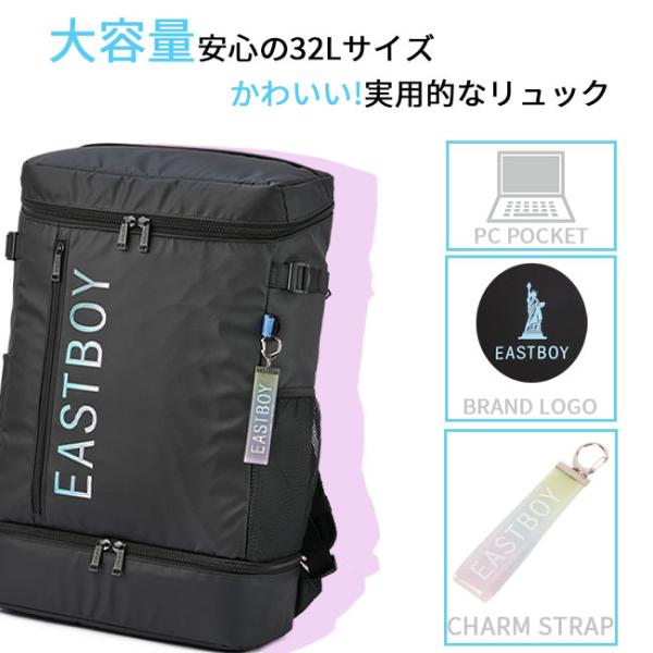 イーストボーイ スクバ スクールバッグ リュック 30L 新作 通学 女子 高校生 中学生 軽量 大容量 撥水 黒 スクエア ボックス型 A4 B4 クリア EAST BOY EBA88