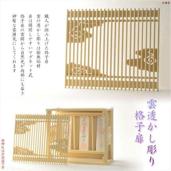 モダン神棚【雲透かし彫り格子扉・鳥居付き三社箱宮:算賀(さんが)桧無垢材・本色】送料無料