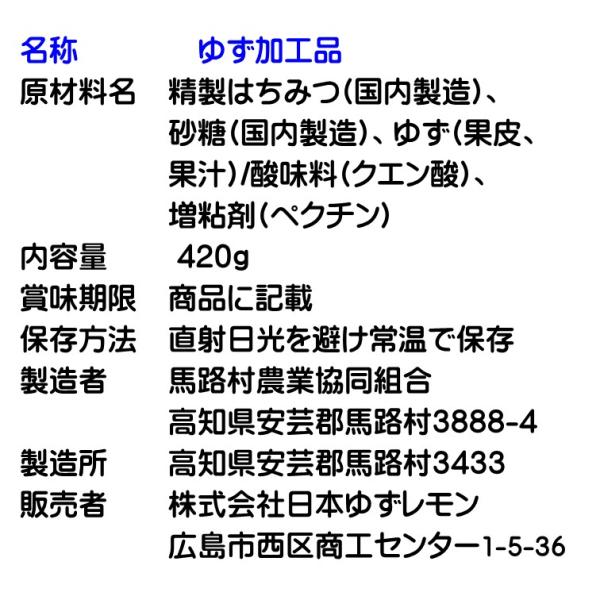 原材料名 精製はちみつ(国内製造)、砂糖(国内製造)、ゆず(果皮、果汁)