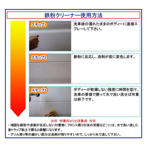 ポリマー加工前やコーティング前の下地処理で必要な鉄粉除去の工程で重宝されるクリーナーです。市販のクリーナーと違いスプレーして洗い流すだけで鉄粉を除去することができます。固く刺さった鉄粉には同時出品のトラップ粘土と合わせて使う事で広範囲の鉄粉取りとピンポイントの鉄粉除去の作業の使い分けができます。