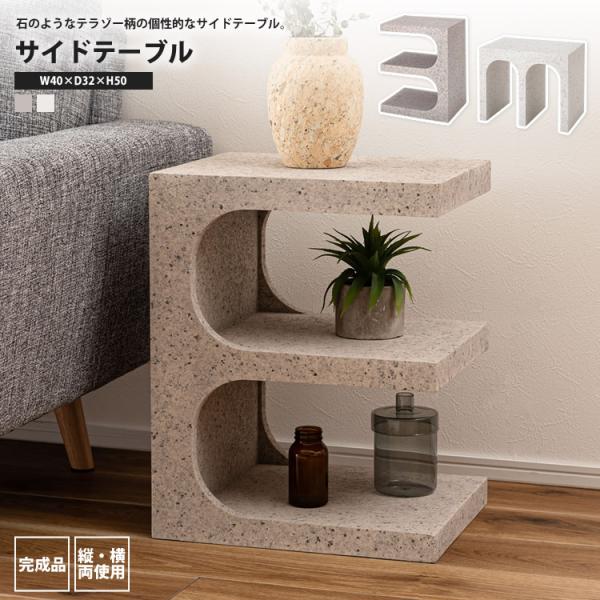 サイドテーブル 高さ50 おしゃれ テラゾー柄 縦横使用可 棚付き 石柄 ラック MAR-14 WH/LGY サイドテーブル