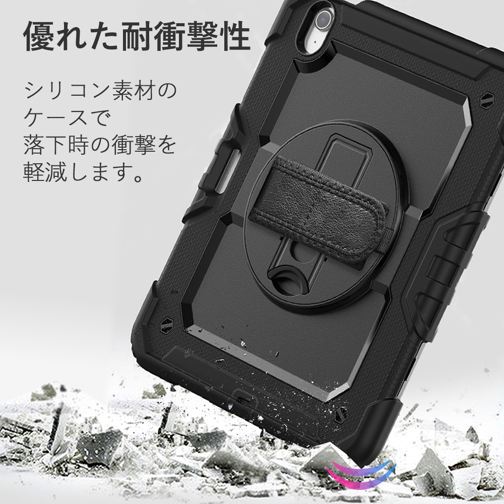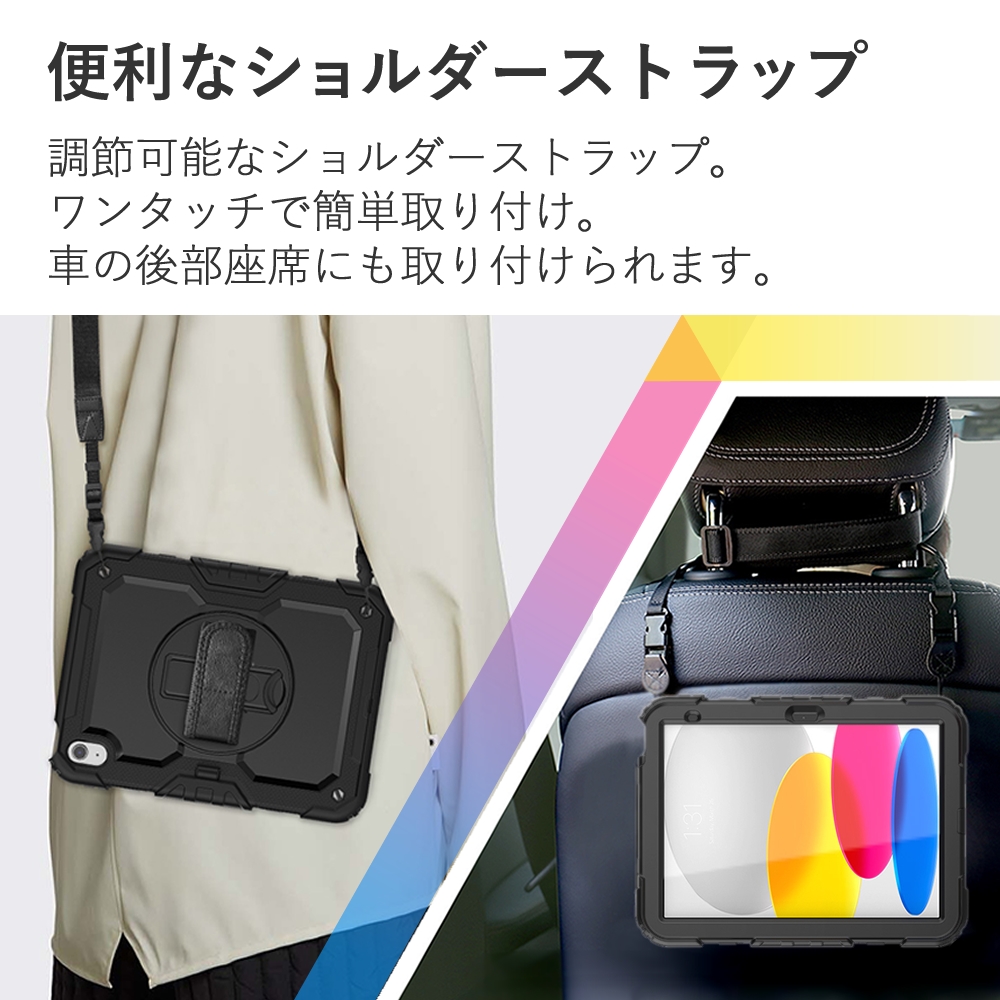 Apple iPad 耐衝撃 ケース と 反射防止 液晶保護フィルム セット 360度回転スタンド ブラック ショルダー 肩紐 ショルダーストラップ付き 頑丈 専用 保護カバー アイパット iPad A16 第11/10/9/8/7世代 iPad Air M3/M2/第5/4世代 iPad Pro 第4/3/2/1世代 互換品 爆買