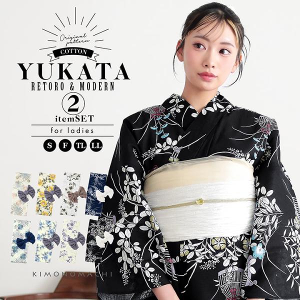 浴衣セット レディース 大人可愛い 浴衣2点セット(浴衣+しわ兵児帯)「糸菊に菊花紋・向日葵・雪輪に花の丸・秋草に虫かご」S/F/TL/LLサイズ 綿(メール便不可)