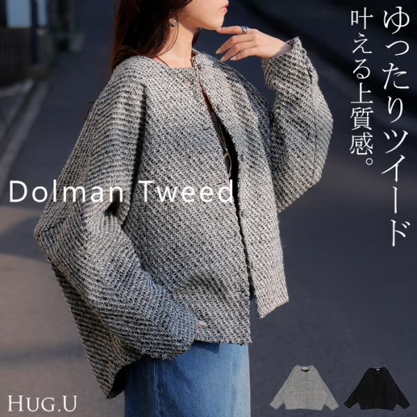 ジャケット ノーカラー ツイード ドルマン ワイド レディース ロング コートドルマンアウター 長袖 羽織