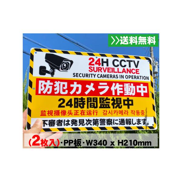 2枚入 送料無料 激安4ヶ国語看板『防犯カメラ作動中』標識 (PP)板1mm厚約W210×H340ミリ 防犯カメラ 警告 禁止 防犯 安全標識 屋外対応 プレート看板 日本製