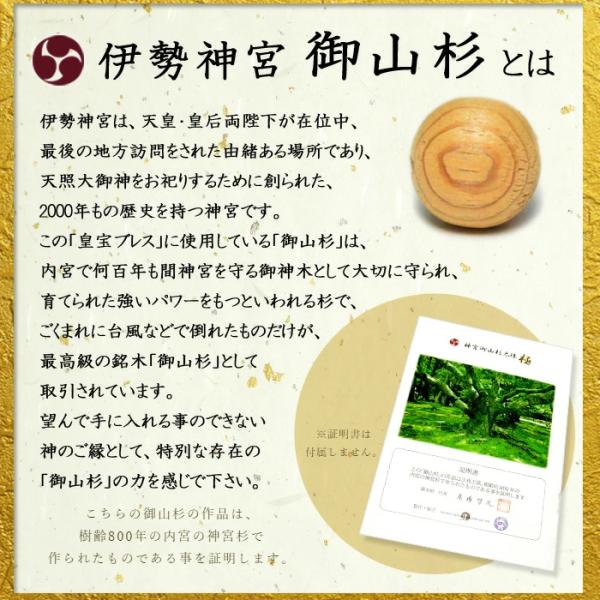 御山杉:伊勢神宮御神木で樹齢300年以上の杉をいいます。特別な力が宿り、喜びと福をもたらしてくれるでしょう。