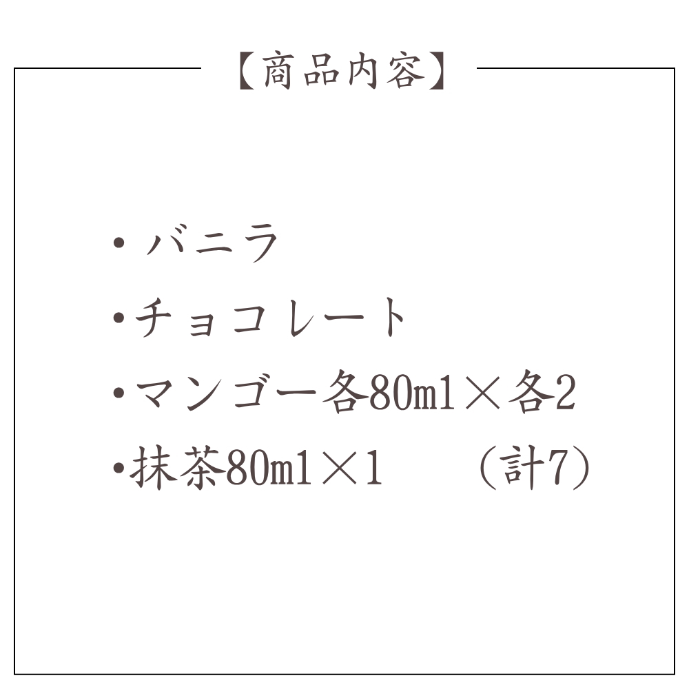 <内容量>バニラ・チョコレート・マンゴー各80ml×各2、抹茶80ml×1(計7)