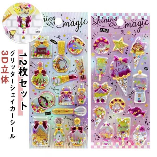 【12枚セット】シャカシャカシール 立体 ぷくぷくシール 装飾用 シール 3D DIY用 ごほうびシール グリッターシール 可愛い ご褒美シール ぷっ