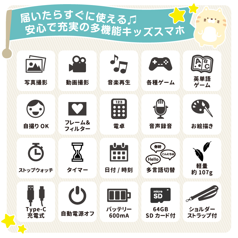 撮影 / 録画 / 録音 / 音楽再生 / ゲーム / ストップウォッチ / タイマー / アラーム / 電卓 / 英語