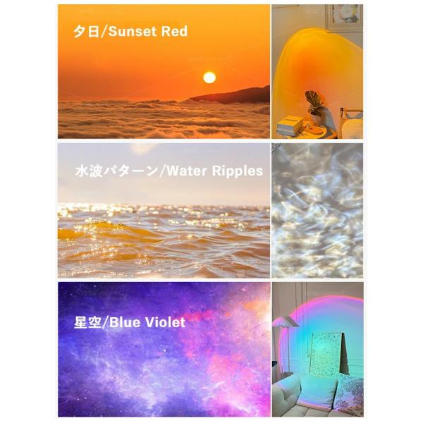 【水波パターン+サンセットライト】ロマンチックな水紋光+夕日投影は癒しの雰囲気がいっぱいです。5色のフィルムが付属しており、異なる視覚体験を提供します。高い光透過率のランプシェード、光透過率は均一で柔らかく、まぶしくないです。