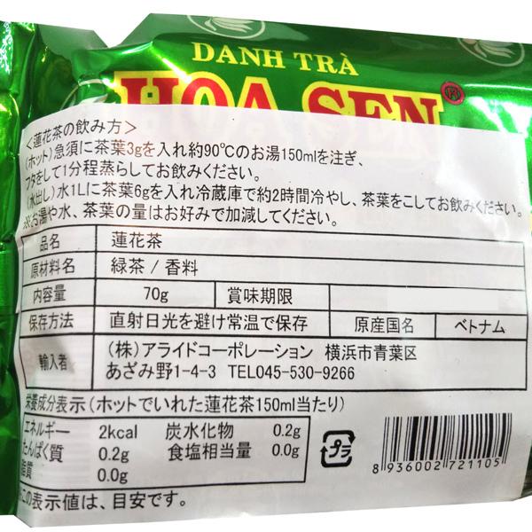 蓮花茶(ロータスティー)70gベトナム伝統のお茶蓮花茶(ロータスティー)はベトナム伝統のお茶です。ベトナム料理店などで人気のお茶です。【商品詳細】・原材料 緑茶、香料・内容量 70g/袋・原料原産地 ベトナム・保存方法 直射日光を避け常温保存