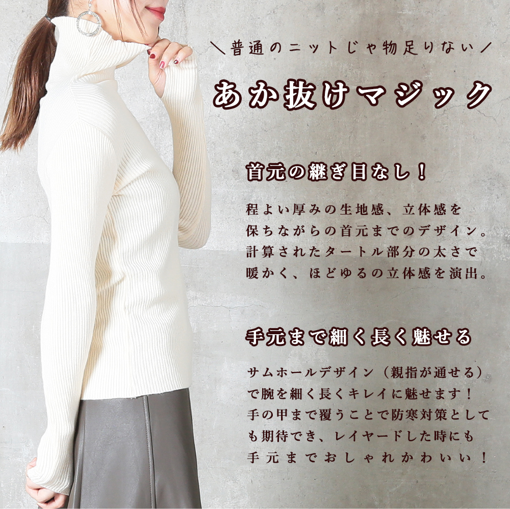 ニット 指穴 リブ タートルネック レディース プルオーバー 長袖 カットソー トップス 冬 無地 フィンガーホール インナー