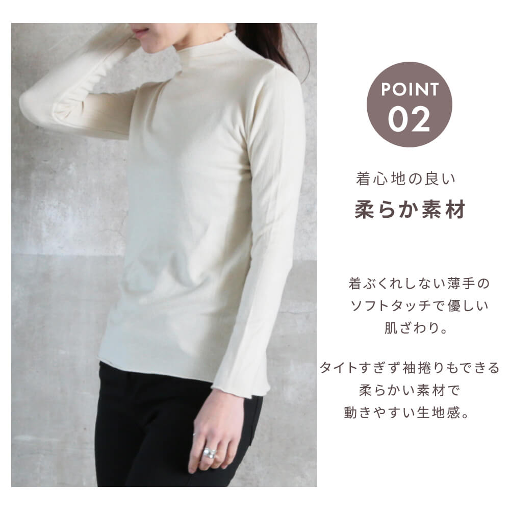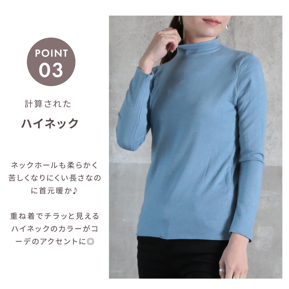 ハイネックで首回りは暖かく、滑らかで柔らかいニット素材。