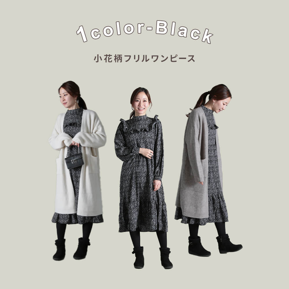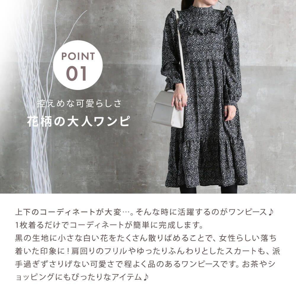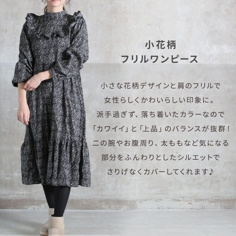 即納 フリルワンピース 花柄 レディース ロング丈 フリル 上品 フレア きれいめ 秋冬 長袖 体型カバー ボリュームフレア 大人 大きいサイズ スタイルアップ ママ 楽ちん ゆったり お出かけ 送料無料