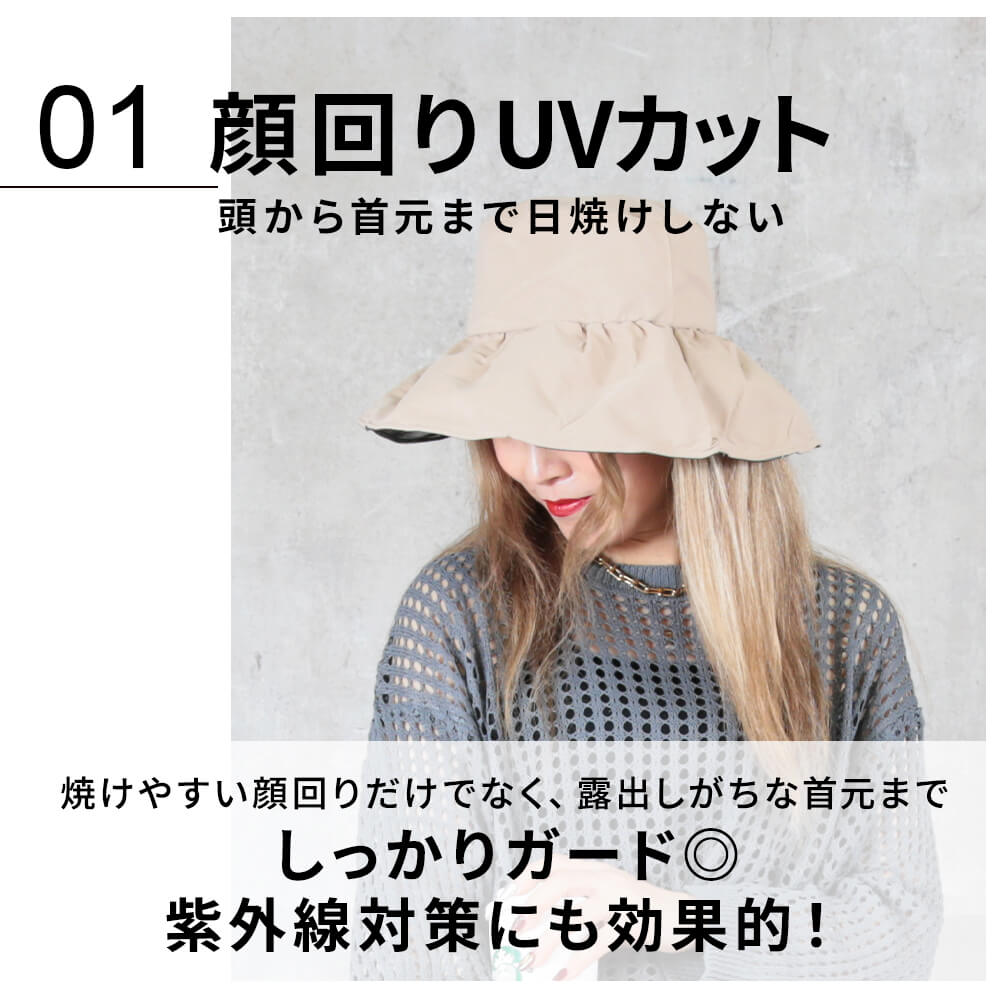調節可能なあご紐つきで飛ばされにくく、ずれにくい設計。ヘアスタイルを気にせず、帽子スタイルが楽しめます。焼けやすい顔回りだけでなく、露出しがちな首元までしっかりガード◎紫外線対策にも効果的です。